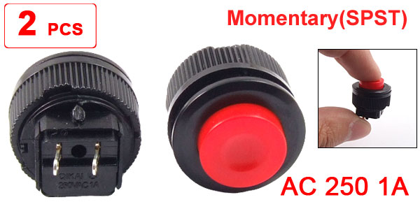Product Name Push Button Switch Action Type Momentary Contact Type NO Poles SPST Rating Voltage AC 250 1A Terminals Quantity 2 Pins Thread Diameter 15.5mm/0.6" Button Dia. 12mm/0.47" Terminals Pitch 5mm/ 0.2" Overall Size 17 x 20mm/0.7" x 0.78"(Max.D*H) Material Plastic & Metal Color Red & Black Weight 7g Package Content 2 x SPST Push Button Switch - Reviews