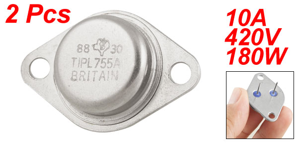 Product Name Power Transistor Part Number TIPL755A Collector-Emitter Voltage 420V Collector Current(Ic) 10A Pd 180W Material Metal Package TO-3 Body Dimension 3.8 x 2.5 x 0.8cm/1.5" x 0.98" x 0.3"(L*W*T) Hole Diameter 4mm/0.15" Pin Length 10mm/0.4" Color As Picture Shown Net Weight 20g Package Content 2 x Power Transistor - Reviews