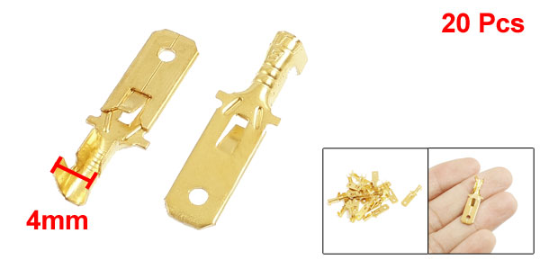 Product Name Male Spade Terminal Connector Material Brass Fit Stud Width 6.3mm / 1/4" Total Size 24 x 8 x 5mm / 0.94" x 0.3" x 0.2"(L*W*H) Fit Cable Diameter 4mm/ 0.16" Main Color Gold Tone Weight 14g Package Content 20 x Male Spade Terminal Connector - Reviews