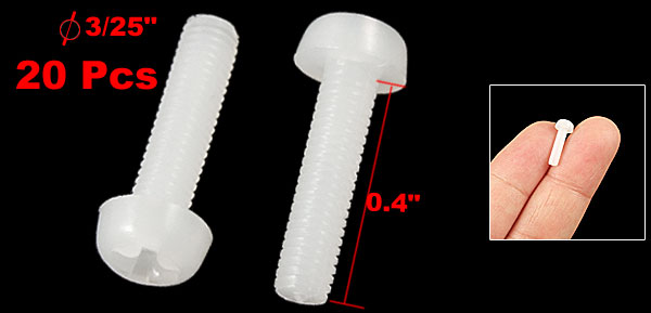 Product Name Screw Type Round Phillips Head Quantity 20 Pcs Thread Length 10mm/ 0.4" Thread Diameter 3mm / 3/25" Overall Size 12 x 5.5mm/ 0.47" x 0.22" (L*D) Material Plastic Color Off White Net Weight 3g Package Content 20 x Cross Head Screw - Reviews