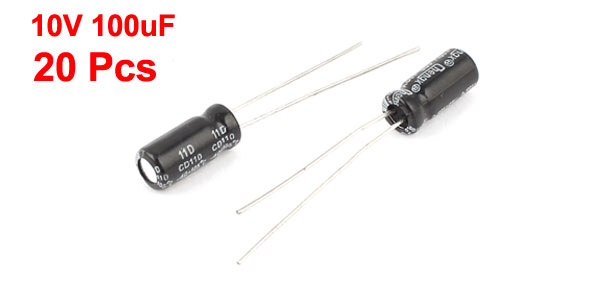 Product Name Electrolytic Capacitor Type Radial Leads Temperature Range -40~+105C Voltage 10V Capacitance 100uF Body Size 5 x 11mm/0.2" x 0.43"(D*H) Lead Space 2mm/0.08" Lead Length 21mm/0.8" , 27mm/1" External Material Aluminum Total Net Weight 9g Main Color Black Package Content 20 x Electrolytic Capacitors - Reviews