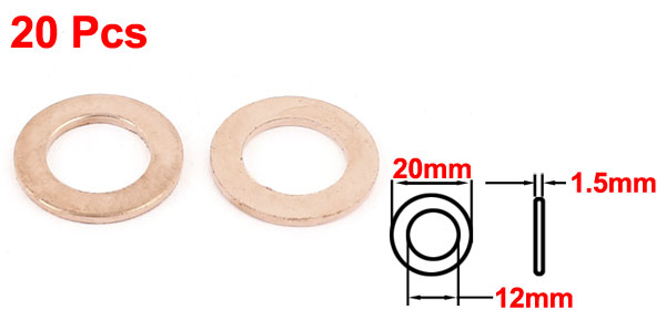 Product Name Copper Washer Total Size 12 x 20 x 1.5mm/0.47" x 0.8" x 0.06"(Inner Dia*OD*T) Material Copper Color Copper Tone Net Weight 48g Package Content 20 x Copper Washers - Reviews