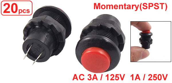 Product Name Push Button Switch Action Type Momentary Contact Type NO Poles SPST Rating Voltage AC 3A / 125V, 1A / 250V Terminals Quantity 2 Pins Thread Dia. 12mm / 0.47" Button Dia. 9.6mm / 0.4" Terminals Pitch 5mm/0.19" Overall Size 26 x 16mm / 1" x 0.6"(Max. L * D) Material Plastic & Metal Color Red & Black Weight 41g Package Content 20 x Push Button Switch - Reviews