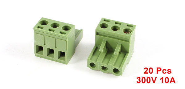 Details20 Pcs 300V 10A Single Row 3 Positions Pluggable Terminal Block Oliver Green  Product Name Pluggable Terminal Block Type Single Rows, 3 Positions Pin Pith 5.08mm Rated Voltage 300V 10A Total Size 1.6 x 1.5 x 2.2cm/ 0.6" x 0.6" x 0.9"(L*W*H) Material Metal, Plastic Color Olive Green Weight 100g Package Content 20 x Terminal Block