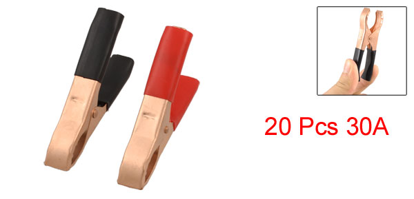 Product Name Alligator Clip Material Soft Plastic, Metal Color Black, Red, Copper Tone Rated Current 30A Overall Size(Each) 77 x 39 x 13mm / 3" x 1.5" x 0.5"(L*W*T) Jaw Open Width 20mm / 0.787"(Max.) Weight 202g Package Content 20 Pcs x Alligator Clips - Reviews