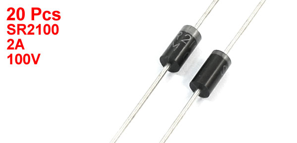 Product Name Schottky Rectifier Diode Model SR2100 Forward Current 2A Max Peak Reverse Voltage 100V Lead Size(Each Side) 0.7 x 27mm/0.01" x 0.1"(D*L) Body Size 3 x 6.5mm/0.12" x 0.25"(D*L) Color Black Weight 8g Package Content 20Pcs x Schottky Rectifier Diodes - Reviews