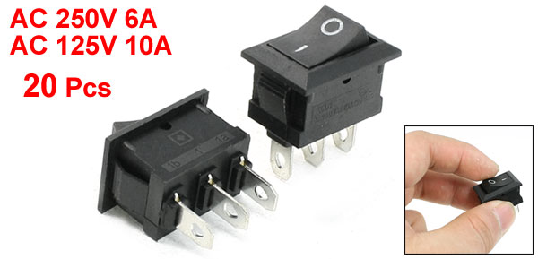 Product Name Rocker Switch Poles SPDT Terminals 3 Pin (On - Off) Rating Voltage AC 250V 6A, AC 125V 10A Total Size(Each One) 3.1 x 1.4 x 2.8cm/ 1.2" x 0.6" x 1.1"(L*W*H) Mount Hole Size 26 x 10mm/ 1" x 0.39"(L*W) Color Black Material Plastic, Metal Total Weight 76g Package Content 20 Pcs x Rocker Switch - Reviews