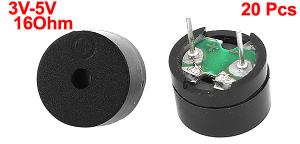 Product Name Passive Electronic Alarm Buzzer Input Voltage(Max.) 3V-5V Resistance 16Ohm Resonance Frequency 2000HZ Body Size 12 x 8.2mm / 0.47" x 0.32" (D*T) Pin Pitch 6mm / 0.24" External Material Plastic Color Black Weight 24g Package Content 20 x Passive Electronic Alarm Buzzer