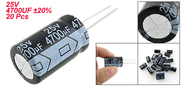 Product Name Aluminum Electrolytic Capacitor Type Radial Lead Quantity 20 Pcs Maximum Temperature 105°C Voltage 25V Capacitance 4700uF Capacitance Tolerance ±20% Body Size 16 x 26mm/ 0.63'' x 1.02'' (D*L) Lead Spacing 7mm/ 0.27'' Lead Length 28mm/ 1.1'', 23mm/ 0.9'' External Material Aluminum Weight 154g Color As Picture Shown Package Content 20 Pcs x Electrolytic Capacitors - Reviews