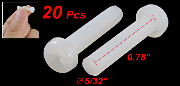 Product Name Screw Type Round Phillips Head Quantity 20 Pcs Thread Length 20mm/ 0.78" Thread Diameter 4mm / 5/32" Overall Size 22.5 x 7mm/ 0.88" x 0.27"(L*D) Material Plastic Color Off White Net Weight 7g Package Content 20 x Cross Head Screw - Reviews