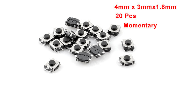 Product Name Tact Switch Acuion Type Momentary Switch Size 4 x 3 x 1.8mm / 0.16" x 0.1" x 0.07"(L*W*T) Material Plastic, Metal, Electric Parts Color Black, Silver Tone Weight 2g Package Content 20 x Tact Switches - Reviews