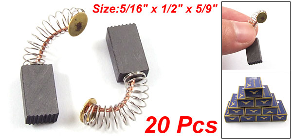 Product Name Carbon Brush Material Carbon & Metal Color Black & Gold Tone Carbon Brush Size(Each) 8 x 5 x 14mm / 5/16" x 1/2" x 5/9" (L*W*H) Total Length(Approx) 34mm / 1.34" (When Spring Stretching) Total Weight 29g Package Content 20 Pieces of Carbon Brush - Reviews