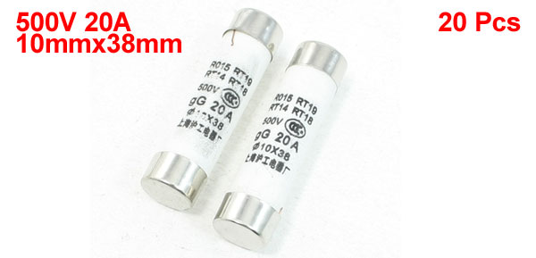 Product Name Ceramic Fuse Model R015 RT14 RT18 RT19 Type Fast Blow Rated Voltage 500V Rated Current 20A Total Size 10 x 38mm/ 0.4" x 1.5" (D*L) Material Metal, Ceramic, Electronic Parts Main Color White, Silver Tone Weight 115g Package Content 20 x Ceramic Fuses - Reviews