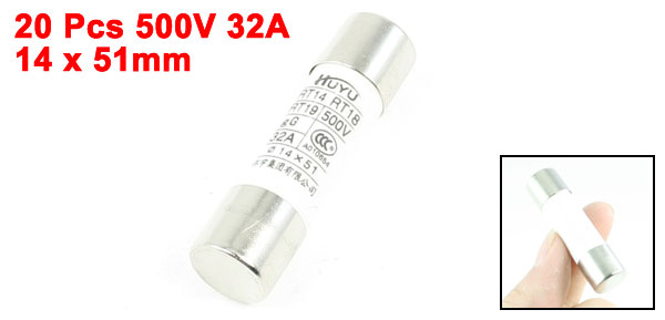 Product Name Ceramic Fuse Model RT14 RT18 RT19 Type Fast Blow Rated Voltage 500V Rated Current 32A Total Size 14 x 51mm/ 0.55" x 2" (D*L) Material Metal, Ceramic, Electronic Parts Main Color White, Silver Tone Weight 321g Package Content 20 x Ceramic Fuses - Reviews