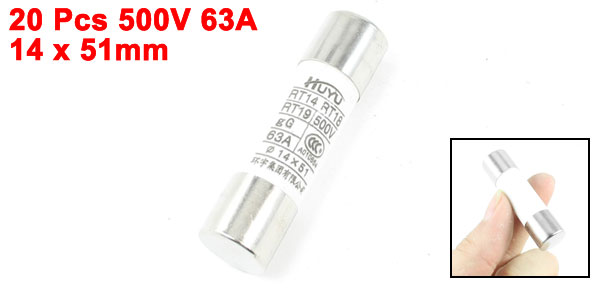 Product Name Ceramic Fuse Model RT14 RT18 RT19 Type Fast Blow Rated Voltage 500V Rated Current 63A Total Size 14 x 51mm/ 0.55" x 2" (D*L) Material Metal, Ceramic, Electronic Parts Main Color White, Silver Tone Weight 366g Package Content 20 x Ceramic Fuses - Reviews