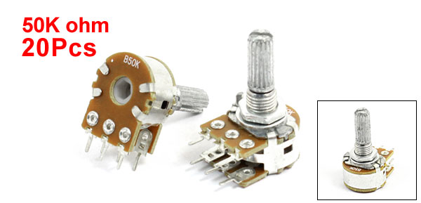 Product Name Potentiometer Resistance Value 50K ohm Power AC 250V Adjustment Type Adjustment Top Type Dual Linear(Type B) Features Knurled Shaft Shaft Diameter 5mm / 0.2" Shaft Length 13mm / 0.31" Mounting Thread Diameter 6.8mm / 0.26" Base Size 16 x10mm / 0.63" x 0.39"(D*H) Total Height 31mm/1.22" Material Metal, Electronic Parts,Carbon Film Net Weight 158g Package 20 x Potentiometer - Reviews