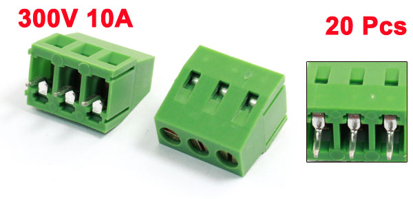 20 Pcs 5mm Pitch 3 Pins 300V 10A Terminal Blocks Connectors Green