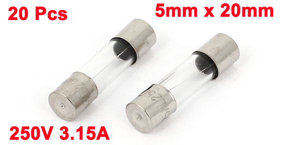 Product Name Glass Tube Fuses Quantity 20 Features Fast Blow(F) Low Breaking Capacity(L) Rated Voltage 250V Rated Current 3.15A Body Size 5 x 20mm/ 0.2" x 0.8"(D*L) Material Glass, Metal Color Silver Tone, Clear Weight 15g Package 20 x Glass Tube Fuses - Reviews