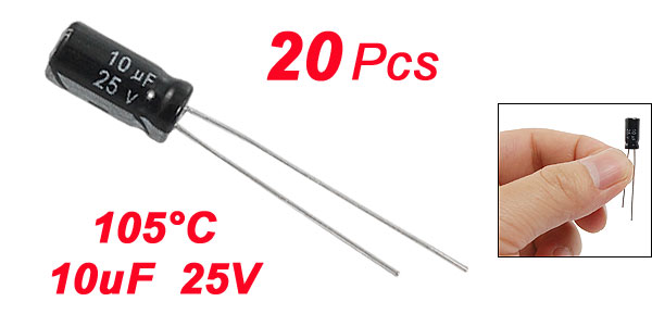 Product Name Electrolytic Capacitor Type Radial Lead Maximum Temperature 105°C Voltage 25V Capacitance 10uF Capacitance Tolerance ±20% Size 5 x 11mm / 0.2" x 0.43" (D*L) Lead Spacing 2mm Lead Length 21mm, 25mm External Material Aluminum Weight 10g Color As Picture Shown Package Content 20 Pcs x Electrolytic Capacitors - Reviews