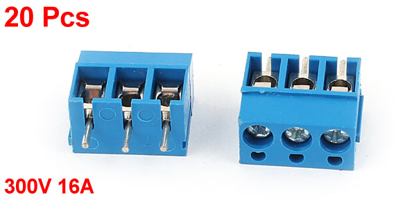 Product Name Screw Terminal Block Pitch 5mm Poles 3P Material Scerws M3, Steel, Zinc Plated Wire Guard Phosphor Bronze, Ni Plated or Stainless Steel Pin Header Brass, Tin Plated Housing PBT, UL94-0 Electrical Rated Voltage 300V Rated Current 16A Withstanding Voltage AC1500V/1Min Wire Range 22-14 AWG Mechanical Temp Range -30C-+120C MAX Soldering +250C for 5 sec Torque 0.5 nm(4.4lb.in) Strip Length 4.5-5mm Color Blue, Silver Tone Weight 69g Package Content 20 x Screw Terminal Block - Reviews