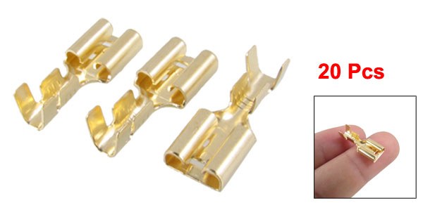 Product Name Female Spade Terminal Connector Material Brass Fit Stud Width 6.8mm / 17/64" Total Size 19 x 7.7 x 5mm / 0.73" x 0.3" x 0.2"(L*W*H) Fit Cable Diameter 3mm/ 3/25" Main Color Gold Tone Weight 15g Package Content 20 x Female Spade Terminal Connector - Reviews