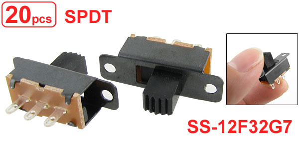 Product Name Slide Switch Model SS-12F32G7 Action Type SPDT Contact Type ON/ON, 2 Positions Pins Quantity 3 Working Power 0.5A 50V DC Contact Resistance 30mΩ Max Insulation Resistance 100mΩ Min at 500V DC Withstand Voltage AC 500V for 1 min Terminals Size(Each One) 4.5 x 1.7mm/ ( L * W) Switch Total Size 23.4 x 7.4 x 19mm/ (L * W* H) Knob Size 5.4 x 3.8 x 7mm/ (L * W * H) Material(External) Plastic, Metal Main Color Black Weight 34g Package Content 20 x Slide Switch - Reviews