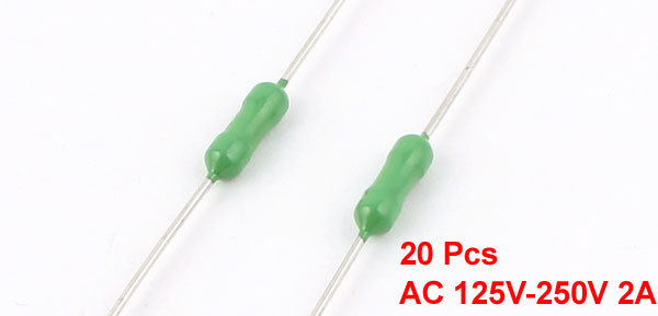 Product Name Axial Leaded Fuse Material Resin, Metal Type Fast Acting Rated Voltage AC 125V-250V Rated Current 2A Mounting Type Through Hole Lead Style Axial Total Size 3 x 62mm / 0.1" x 2.4" (D*L) Weight 6g Package 20 x Axial Leaded Fuse - Reviews