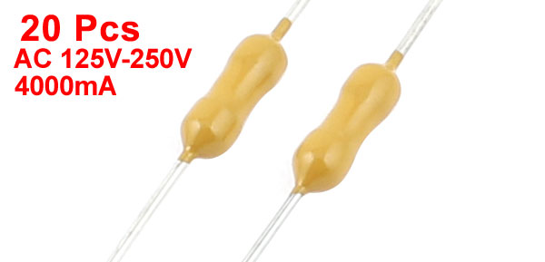 Details20 Pcs AC 125V-250V 4000mA Time-delay Slow Blow Axial Leaded Fuses 3 x 62mm  Product Name Axial Leaded Fuse Material Resin, Metal Type Slow Blow Rated Voltage AC 125V-250V Rated Current 4000mA Mounting Type Through Hole Lead Style Axial Total Size 3 x 62mm / 0.1" x 2.4" (D*L) Weight 6g Package 20 x Axial Leaded Fuse