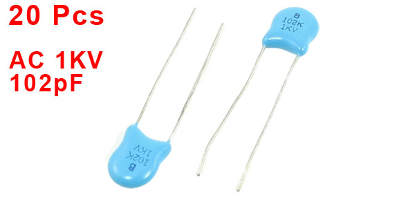Product Name Ceramic Disc Capacitors Rated Voltage AC 1KV Capacitance 102pF Body Size 8 x 6 x 3mm/ 0.31" x 0.23" x 0.11" (L*W*T) Lead Space 5mm/ 0.19" Lead Length 21mm/ 0.8" Main Color Blue, Silver Tone Weight 15g Package Content 20 Pcs x Ceramic Disc Capacitors  - Reviews