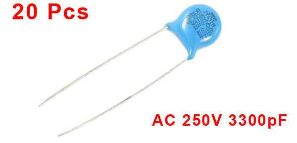 Product Name Ceramic Disc Capacitors Rated Voltage AC 250V Capacitance 3300PF Body Size 9 x 4mm/ 0.35" x 0.15" (D*T) Lead Space 7mm/ 0.2" Lead Length 26mm/ 1" Main Color Blue, Silver Tone Weight 20g Package Content 20 Pcs x Ceramic Disc Capacitors - Reviews
