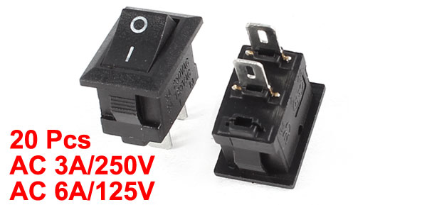 Item Name Rocker Switch Action Type SPST Rated Power AC 3A/250V, AC 6A/125V Color Black Size 1.5 x 1 x 1.8cm / 0.6" x 0.4" x 0.7" (L*W*H) Mounting Size 13 x 9mm / 0.5" x 0.35" (L*W) Material Plastic, Metal Total Weight 29g Package Content 20 x Rocker Switch - Reviews
