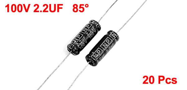 Product Name Electrolytic Capacitor Type Axial Lead Features Standard General Purpose Maximum Temperature -40°C+ 85° Withstand Voltage 100V Capacitance 2.2UF Body Size 16 x 32mm / 0.6" x 1.3" (D*L) Lead Length 35mm/ 1.4", 36mm/ 1.5" Dielectric Material Aluminum Weight 17g Color As Picture Shown Package Content 20 Pcs x Electrolytic Capacitors