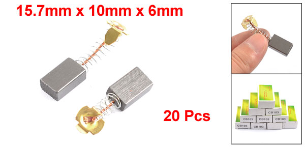 Product Name Carbon Brush Carbon Brush Size 15.7 x 10 x 6mm / 5/8" x 25/64" x 15/64" (L*W*H) Total Length 39mm / 1.5'' (When Spring Stretching) Material Carbon,Metal Color As Picture Show Net Weight 52g Package Content 20 Pieces of Carbon Brush - Reviews