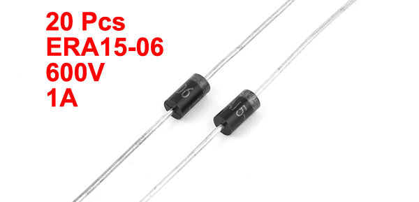 Product Name Rectifier Diodes Model ERA15-06 Package Type DO-41 Maximum Repetitive Peak Reverse Voltage 600V Maximum Average Forward Rectified Current 1A Body Size 6 x 3mm / 0.24" x 0.12"(L*D) Length 60mm / 2.4" Color Black, Silver Tone Weight 9g Package Content 20 x Rectifier Diodes - Reviews