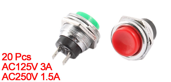 AC250V 1.5AButton Shape Round Shaped Button Diameter 13mm/0.51" Mounting Diameter 15mm/0.63" Total Size 24 x 22mm/0.94" x 0.87"(H* Max.D) External Material Plastic, Metal Color Green, Red, Silver Tone Net Weight 179g Package Content 20 x Push Button Switches - Reviews