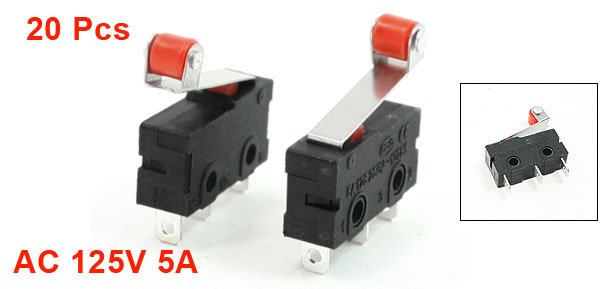 Product Name Micro Switch Voltage & Current AC 125V 5A Contact Type SPDT 1NO 1NC 1COM Action Type Momentary Actuator Type Hinge Roller Lever Terminal Type 3 Pins Overall Size(Pin not included) 20 x 6 x 10mm / 0.8" x 0.2" x 0.4" (L*W*H) Hinge Roller Lever Length 18mm/0.7" Roller Diameter 4.5mm/0.2" Mounting Hole Dia. 2mm / 0.08" Mounting Hole Spacing 9mm/ 0.35" Material Plastic, Metal Color Black, Red, Silver Tone Net Weight 43g Package Content 20 x Micro Switch - Reviews