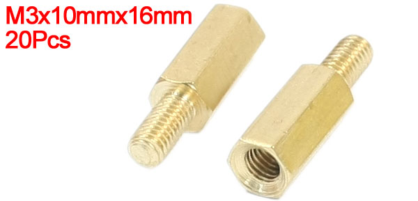 Product Name Standoff Hexagonal Spacer Thread Size M3 Male to Female Male Thread Length 6mm Body Length 10mm Overall Size(Approx) 16 x 5mm / 0.63" x 0.2" (L*Max.D) Material Brass Color Gold Tone Net Weight 28g Package Content 20Pcs x Standoff Hexagonal Spacer - Reviews