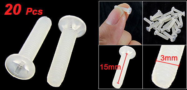 Product Name Screw Type Flat Phillips Head Quantity 20Pcs Thread Length 15mm/ 0.6" Thread Diameter 3mm / 3/25" Overall Size 16 x 5mm/ 0.63" x 0.2" (L*D) Material Plastic Color Off White Net Weight 3g Package Content 20 x Cross Head Screw - Reviews