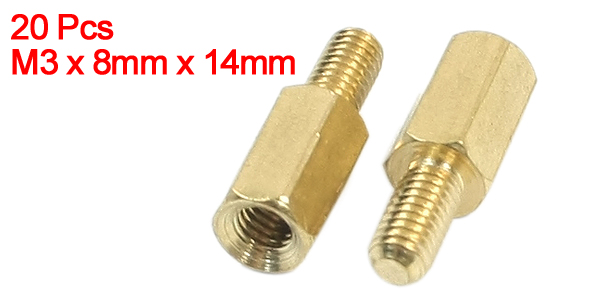 Product Name Standoff Hexagonal Spacer Thread Size M3 Male to Female Body Length 8mm/0.31" Male Thread Length 6mm/0.24" Overall Size(Approx) 14 x 5mm / 0.57" x 0.2" (L*Max.D) Material Brass Color Gold Tone Net Weight 24g Package Content 20Pcs x Standoff Hexagonal Spacer - Reviews