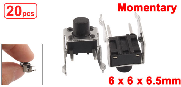 Product Name Tact Switch Contact Type Momentary Contact Switch Size 6 x 6 x 6.5mm / 0.23" x 0.23" x 0.25" (W*L*H) Button Diameter 3mm/ 0.12" Pin Length 5mm/ 0.2" Pin Pitch 5mm/ 0.2" Material Plastic, Metal, Electric Parts Color Black, Silver Tone Net Weight 10g Package Content 20 x Tact Switches - Reviews