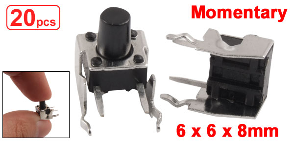 Product Name Tact Switch Contact Type Momentary Contact Switch Dimension 6 x 6 x 8mm / 0.24" x 0.24" x 0.31" (L*W*H) Total Size 11 x 7 x 10.5mm / 0.43" x 0.28" x 0.41" (L*W*H) Button Dia. 3mm / 0.12" Mounting Pin Pitch 6.5mm / 0.26", 4.5mm / 0.18" Mounting Pin Length 4mm / 0.16", 5mm / 0.2" Material Plastic, Metal Color Black, Silver Tone Net Weight 10g Package Content 20 Pcs x Tact Switches - Reviews