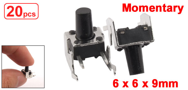Product Name Tact Switch Contact Type Momentary Contact Switch Dimension 6 x 6 x 9mm / 0.24" x 0.24" x 0.35" (L*W*H) Total Size 10.5 x 7 x 11.5mm / 0.41" x 0.28" x 0.45" (L*W*H) Button Dia. 3mm / 0.12" Mounting Pin Pitch 6.5mm / 0.26", 4.5mm / 0.18" Mounting Pin Length 4mm / 0.16", 5mm / 0.2" Material Plastic, Metal Color Black, Silver Tone Net Weight 10g Package Content 20 Pcs x Tact Switches - Reviews