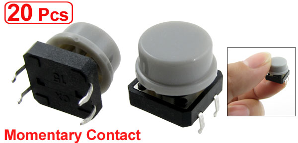 Product Name Tact Switch Contact Type Momentary Contact Dimension 12 x 12 x 11mm / 0.47" x 0.47" x 0.43" (L*W*H) Button Dia. 12mm/ 0.12" Pin Pitch 13 x 5mm / 0.51" x 0.2" (L*W) Pin Length 5mm / 0.2" Material Plastic, Metal, Electric Parts Color Gray, Black, Silver Tone Net Weight 25g Package Content 20 x Tact Switches - Reviews