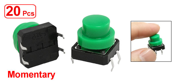 Product Name Tact Switch Contact Type Momentary Dimension 12 x 12 x 11mm/ 0.47" x 0.47" x 0.43" (L*W*H) Button Dia. 8mm/ 0.31" Pin Pitch 12 x 5mm/ 0.47" x 0.2"(L*W) Pin Length 5mm/ 0.2" Material Plastic, Metal, Electric Parts Color Black, Silver Tone Net Weight 25g Package Content 20 x Tact Switches - Reviews