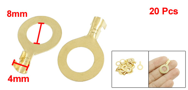 Product Name Non Insulated Ring Terminal Material Brass Fit Stud Diameter 8mm / 0.31" Fit Cable Diameter 4mm / 0.16" Tip Diameter 10mm / 0.39" Total Size 25 x 15 x 5mm/ 1" x 0.59" x 0.2" (L*W*T) Main Color Gold Tone Weight 16g Package Content 20 x Non Insulated Ring Terminal - Reviews