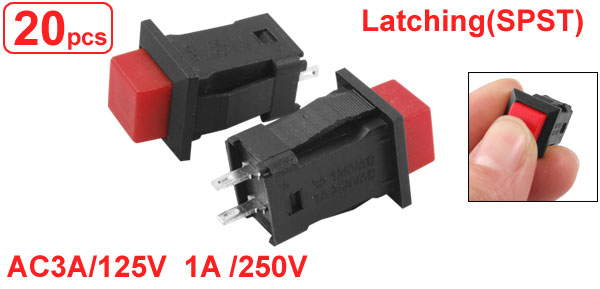 Product Name SPST Push Button Switch Action Type Latching Contact Type NO Rating Voltage AC 3A / 125V; 1A / 250V Terminals Quanlity 2 Pins Mounting Hole Size 12.4 x 10.7mm / 0.488" x 0.421"(L*W) Button Size 9 x 9mm / 0.35" x 0.35"(L * W) Terminals Pitch 5.1mm / 0.2" Overall Size 14 x 14 x 29.4mm / 0.55" x 0.55" x 1.16"(L*W*H) Material Plastic & Metal Color Red & Black Weight 58g Package Content 20 x SPST Push Button Switch - Reviews