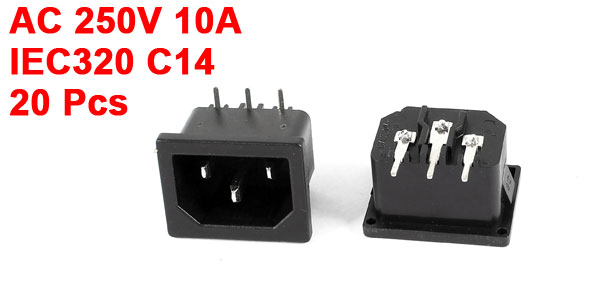 Product Name AC Power Socket Power Supply AC 250V 10A Plug Type IEC320 C14 Terminals Quantity 3 Material Plastic, Metal Color Black, Silver Tone Mounting Size 2.9 x 1.9cm / 1.1" x 0.7" (L*W) Total Size 3.1 x 2.3 x 2cm / 1.2" x 0.9" x 0.78" (L*W*T) Weight 170g Package Content 20 x AC Power Socket