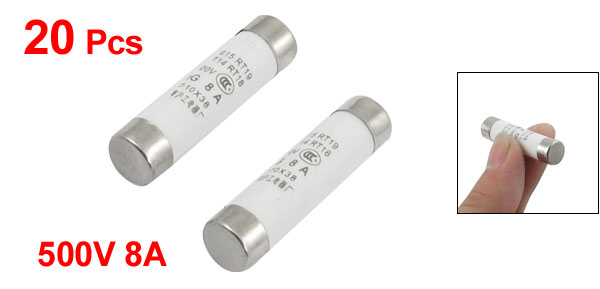 Product Name Cylinder Caps Fuse Model R015 RT19 RT14 RT18 gG Type Fast Blow Material Aluminum, Cermic, Electronic Parts Rated Voltage 500V Rated Current 8A Main Color White, Silver Tone Size 10 x 38mm/ 0.39" x 1.5" (D*L) Weight 111g Package Content 20 x Cylinder Caps Fuse - Reviews