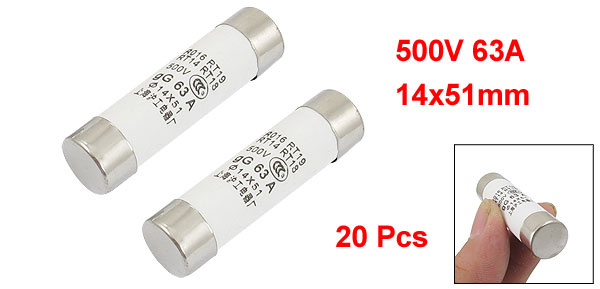Product Name Cylinder Caps Fuse Model R016 RT19 RT14 RT18 gG Type Fast Blow Material Aluminum, Cermic, Electronic Parts Rated Voltage 500V Rated Current 63A Main Color White, Silver Tone Size 14 x 51mm/ 0.55" x 2" (D*L) Weight 259g Package Content 20 x Cylinder Caps Fuse - Reviews