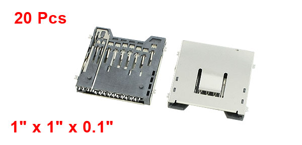 Product Name SD Card Socket Fit for SD Memory Card Insertion & Removal Method Push In, Push Out Material Stainless Steel, Plastic Color Silver Tone Size 26 x 26 x 2.5mm/ 1" x 1" x 0.1"(L*W*T) Net Weight 62g Package Content 20 x Memory Card Sockets - Reviews